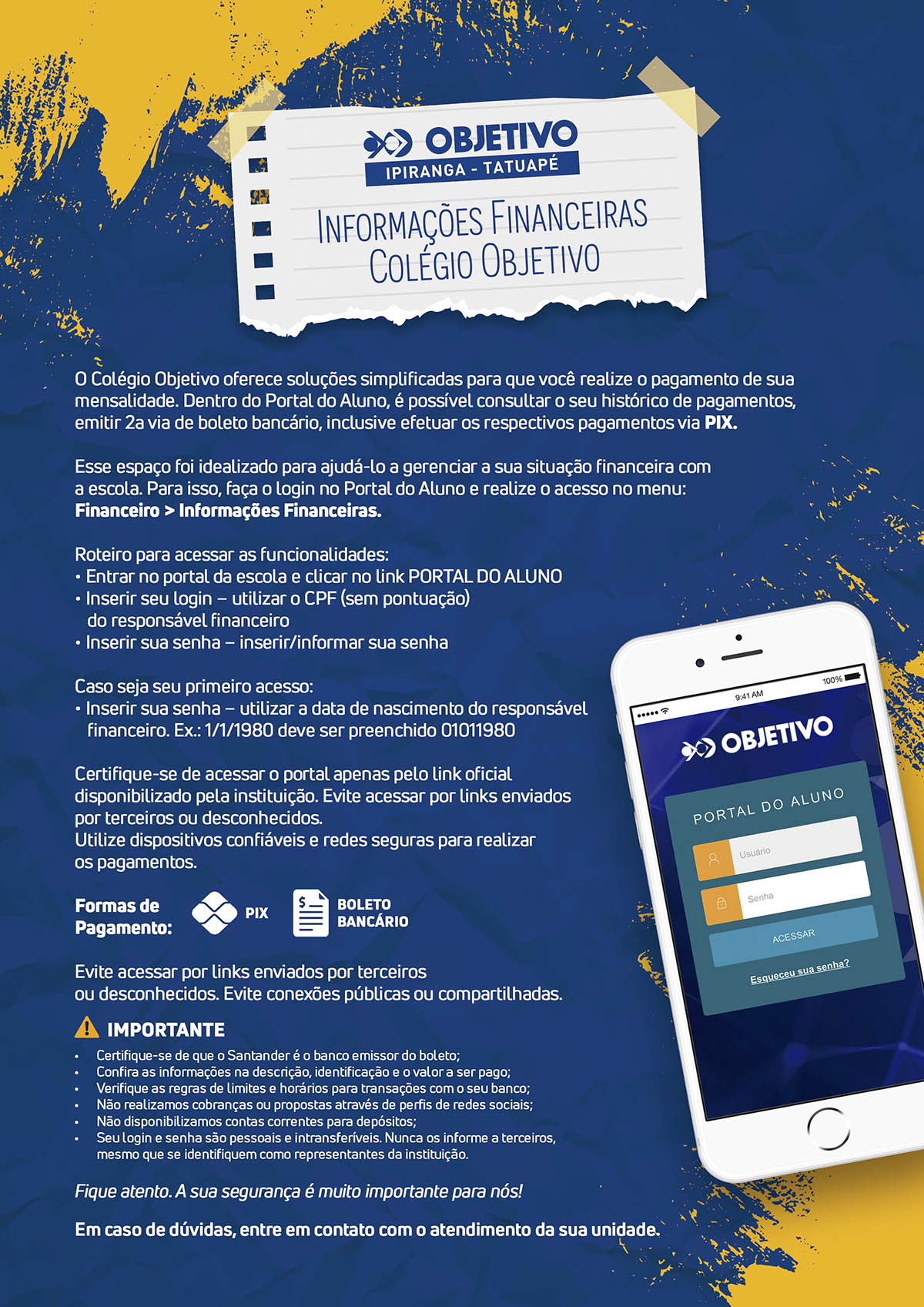 Informações Financeiras Colégio ObjetivoFique por dentro / 19 de dezembro de 2025 O Colégio Objetivo oferece soluções simplificadas para que você realize o pagamento de sua mensalidade.